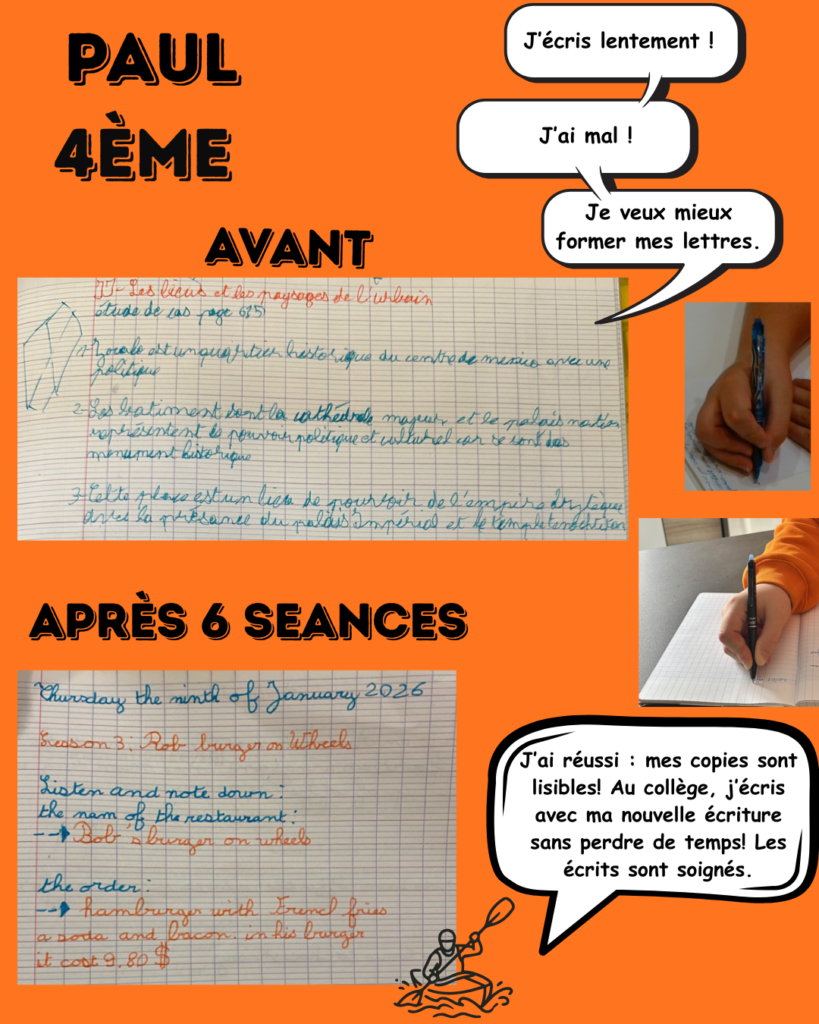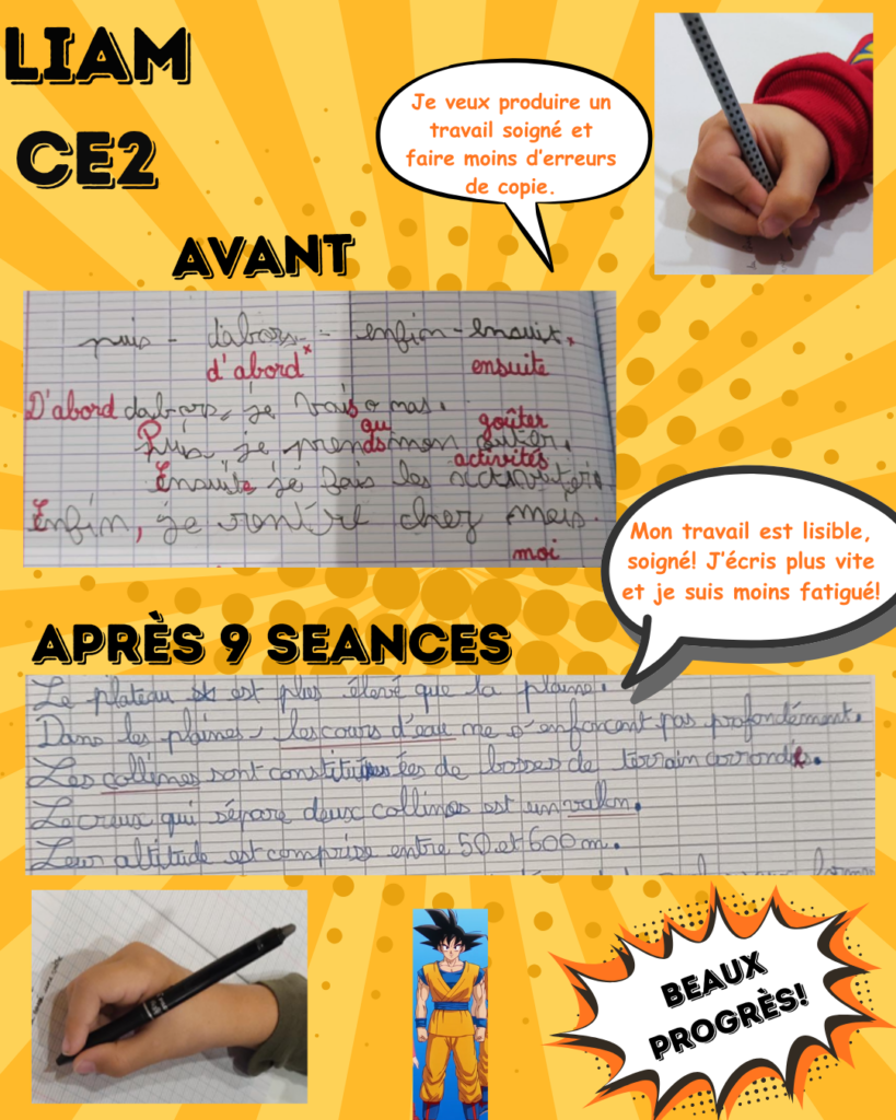 « Chère Mme Nouvellon, Je tenais à vous adresser un sincère message de remerciement pour l’accompagnement que vous avez apporté à mon fils ces dernier mois. Grâce à votre travail, , votre patience et votre bienveillance, son écriture s’est profondément transformée : elle est, aujourd’hui, plus lisible, fluide et surtout sans douleur, alors qu’elle était encore très difficilement déchiffrable il y a peu de temps. Ces progrès ont eu un impact très positif sur sa confiance en lui et son rapport à l’écrit. Nous vous en sommes très reconnaissants. Merci pour votre professionnalisme et votre engagement. »